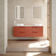 Integrated metallic handle. Fume leather drawer interiors. Organiser in top drawer. Hettich full-extraction rails. Bevelled worktops lined in PVC in two finishes. Option of integrated or countertop washbasin.